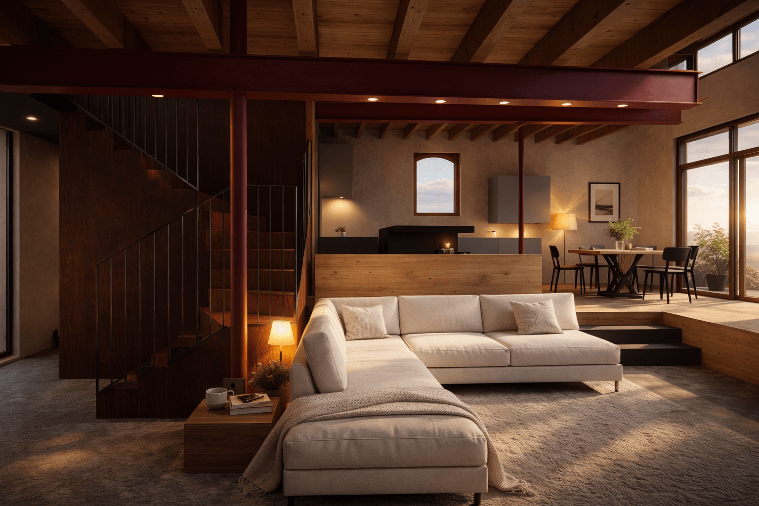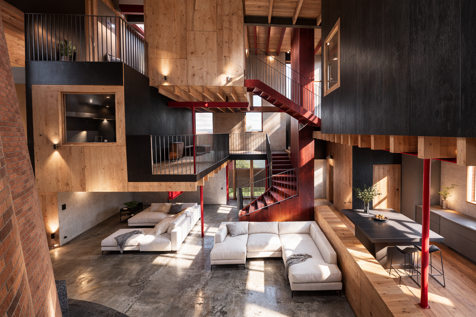Binnen de bestaande schil wordt een nieuwe, onafhankelijke draagstructuur geplaatst. Deze staalconstructie draagt de nieuwe vloeren, balklagen en trappen en verwijst naar de industriële logica van het gebouw. Tegelijk maakt deze constructie een flexibel interieur mogelijk. De woning is opgevat als een ruimtelijk landschap: een grote open leefruimte waarin keuken, eetruimte en zithoek in elkaar overlopen.