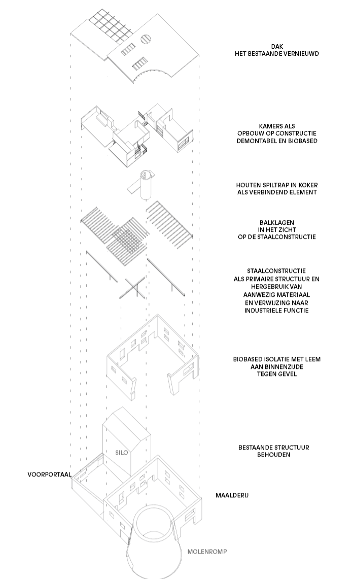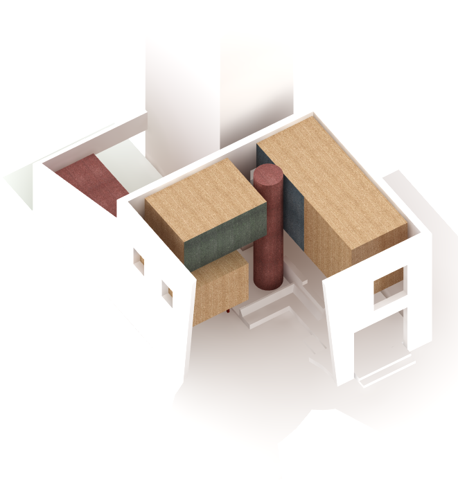 Op de verdiepingen verschijnen kamers als losse volumes in de ruimte. Deze kamers zijn demontabel en opgebouwd uit biobased materialen. Ze vormen een tweede, aanpasbare laag binnen de robuuste structuur van het gebouw. Zo ontstaat een woning die kan veranderen in de tijd zonder dat de hoofddraagstructuur hoeft te worden aangepast.